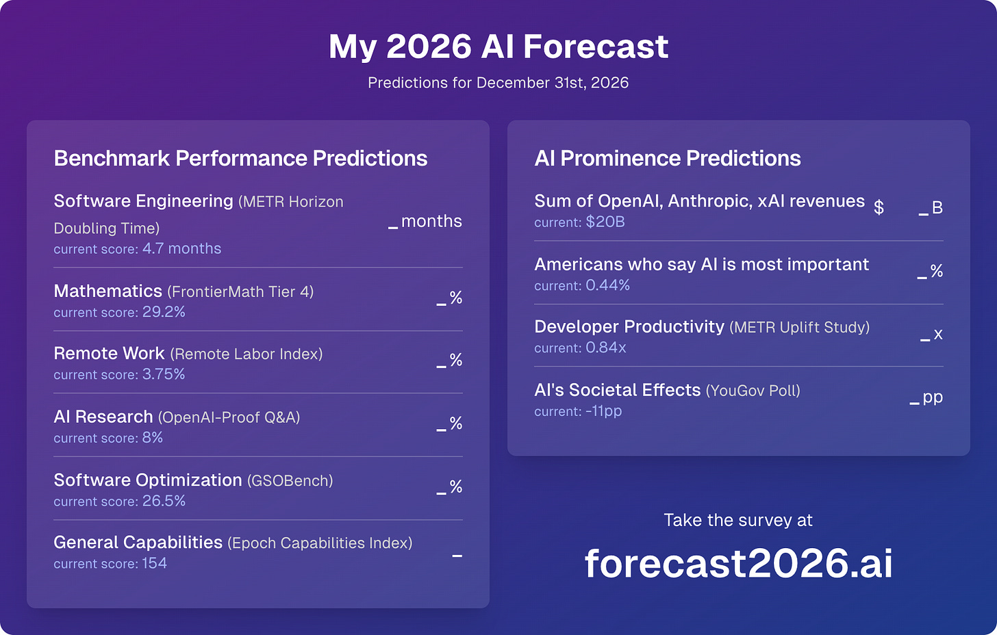 We’ve worked with AI Digest to create a survey where you can forecast how AI will progress in 2026, focusing on the developments that we think are most important to track. We found it useful to pre-register our forecasts in 2025 and compare them to what’s actually happened (more on that below) and thus are excited to do the exercise again.