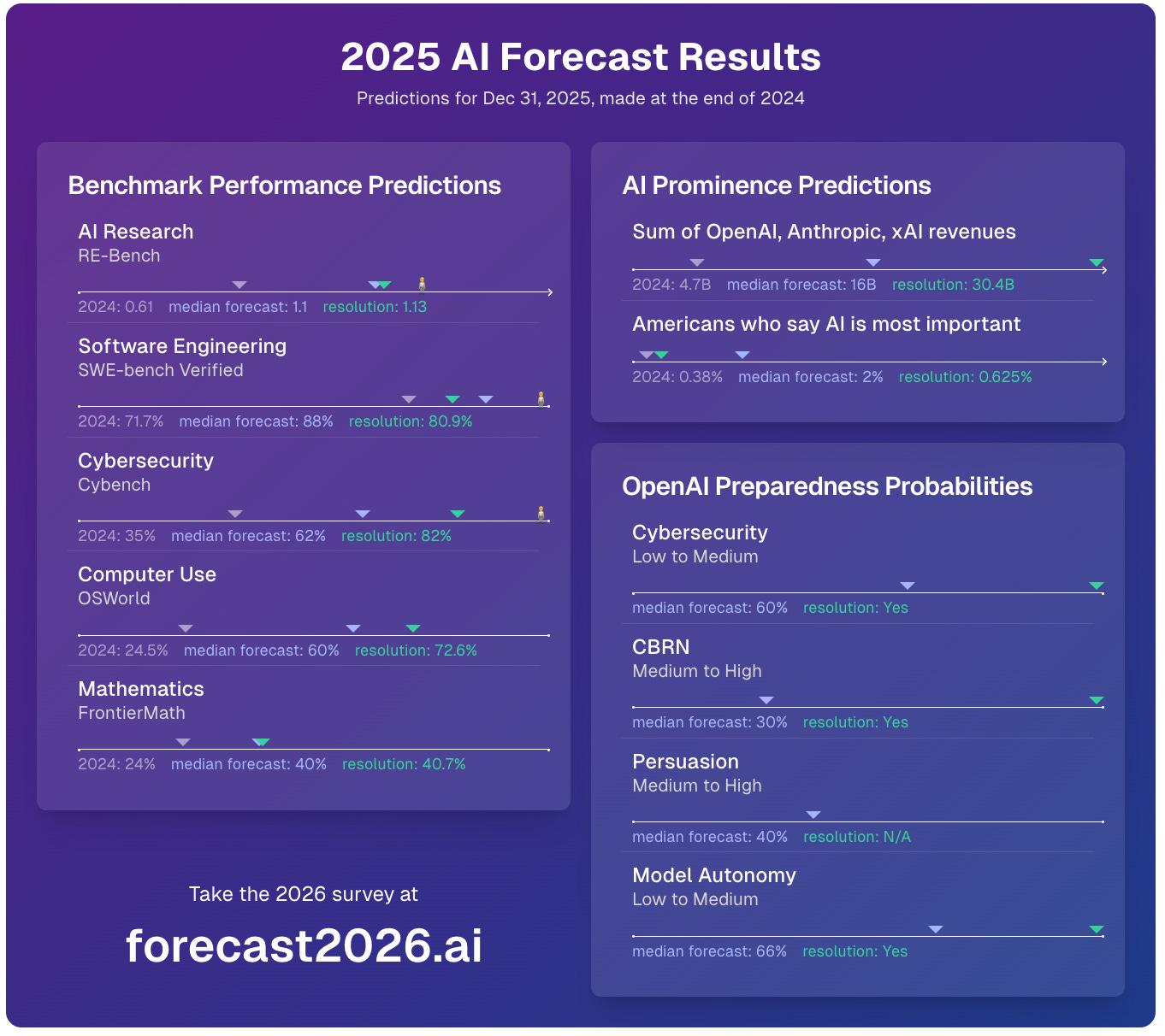 You can read here about how forecasters did in 2025. In short, the forecaster aggregate was about right on benchmarks, underestimated revenue growth, and overestimated public salience. See below for how the aggregate forecast did on each question (the aggregate is simply the median of each forecaster’s median prediction).