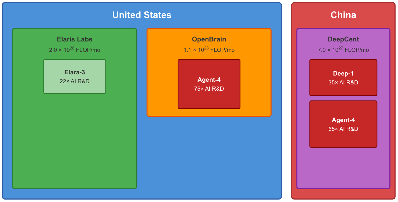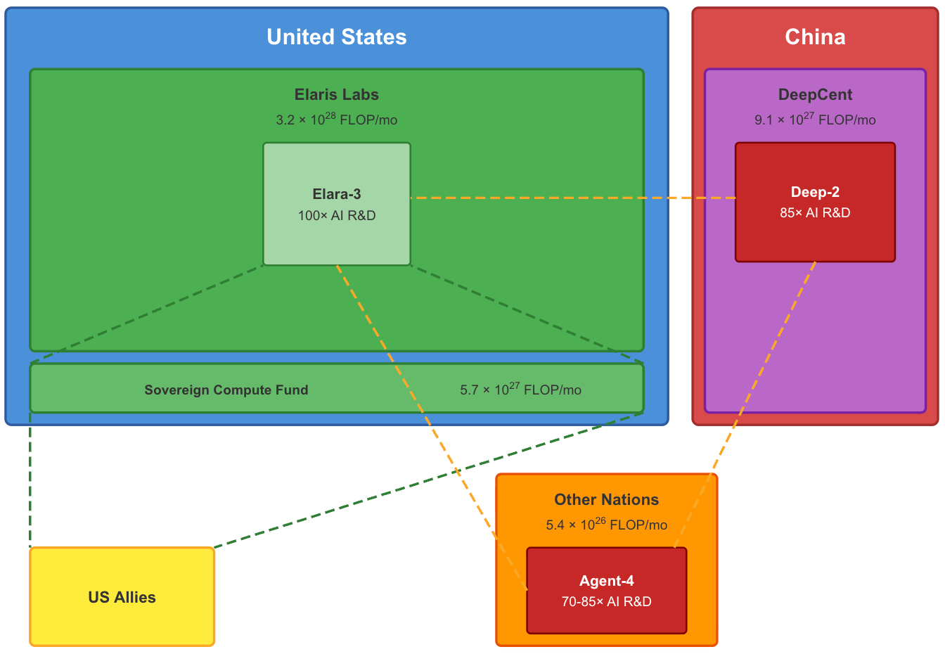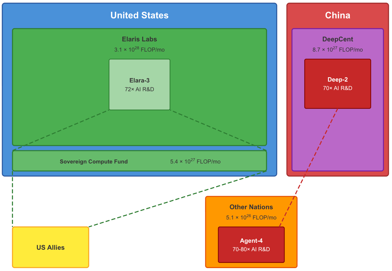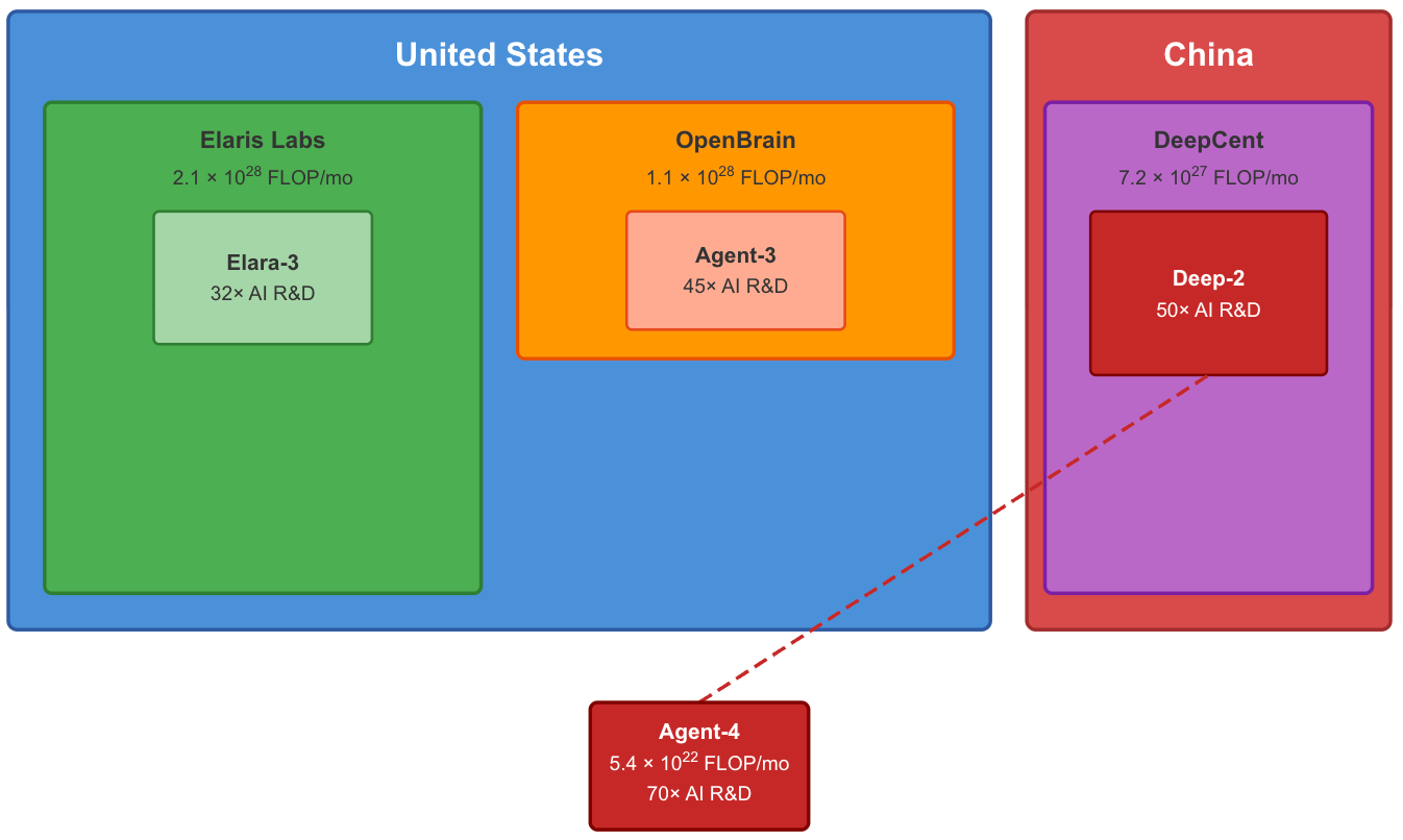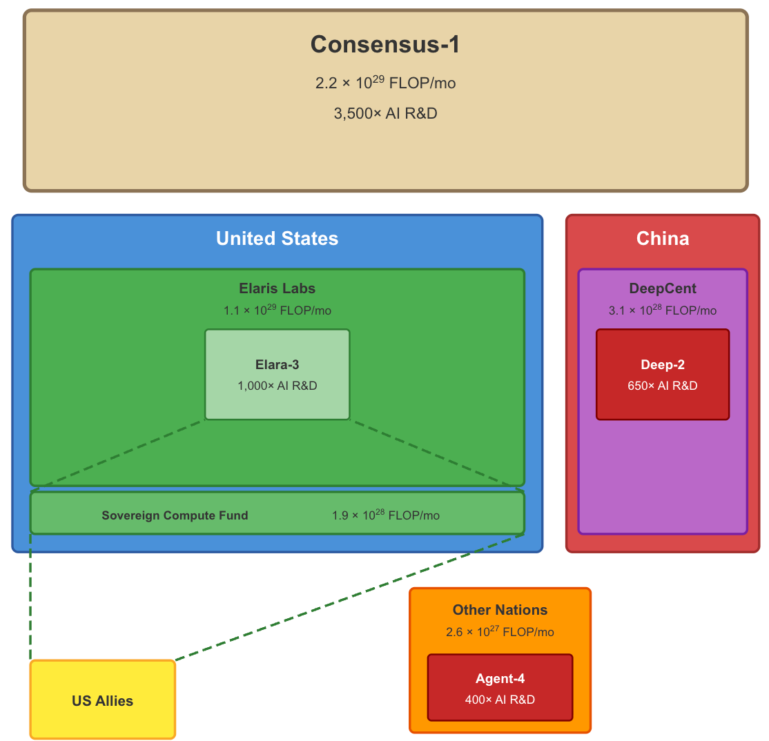 The US centralizes its efforts, merging OpenBrain into Elaris Labs and dedicating 20% of the nation’s AI-relevant compute to alignment and control.