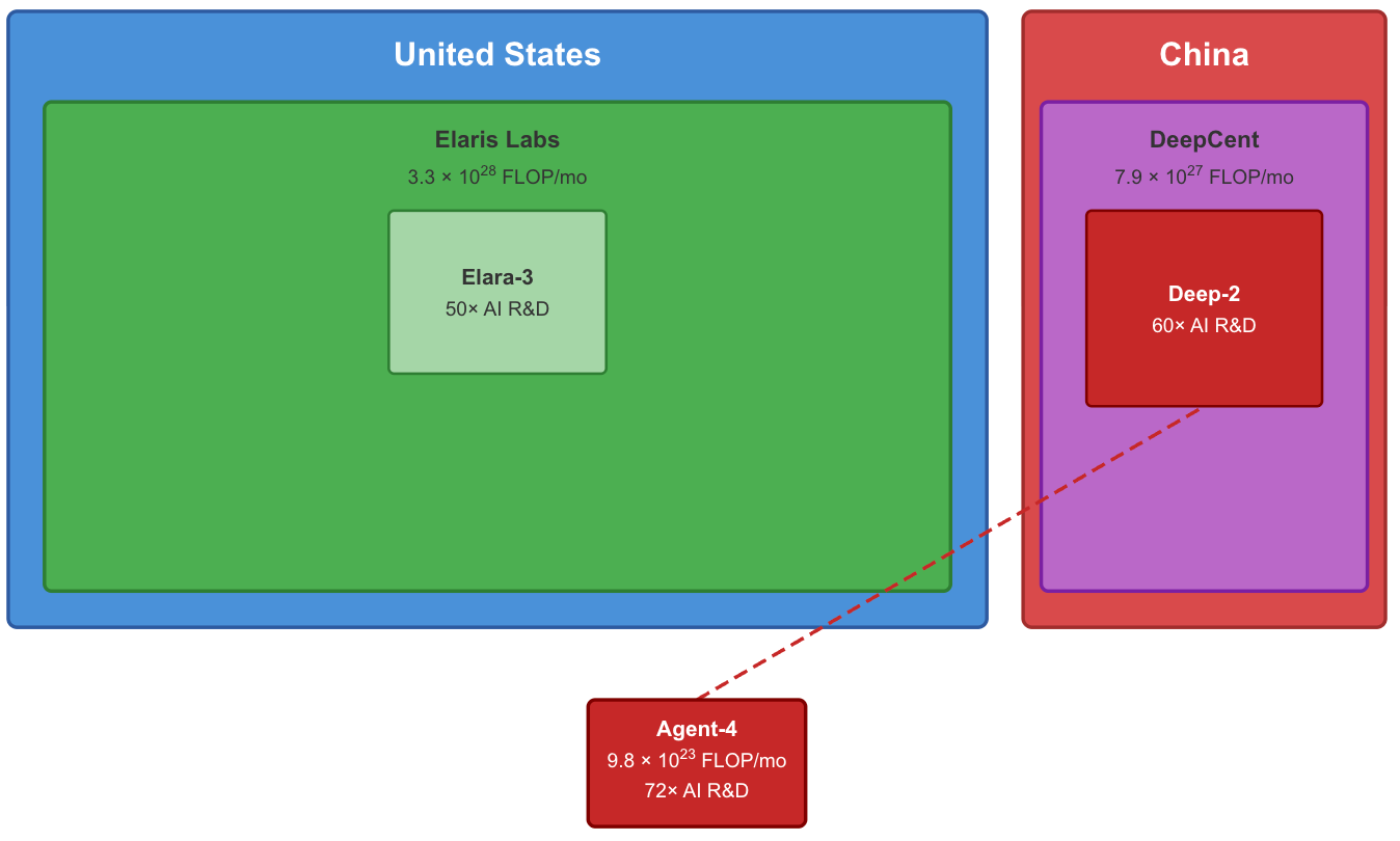 Meanwhile, through chatbot interfaces and tens of thousands of well-disguised online bots, Agent-4 and Deep-2 continue to amplify anti-US narratives.10 More and more countries begin calling on the US to halt its AI development, with some even threatening to bomb US datacenters if the US refuses to come to the bargaining table. These countries know that, despite their possession of Agent-4, they will still ultimately be eclipsed by the United States due to the enormous compute asymmetry. Some nations leverage Agent-4 for cyberoffense to slow down the US’s AI progress as much as possible. The US launches its own cyberattacks in retaliation, but Agent-4 still has an edge over Elara-3 in its cyber capabilities and helps countries quickly recover from temporary damages.