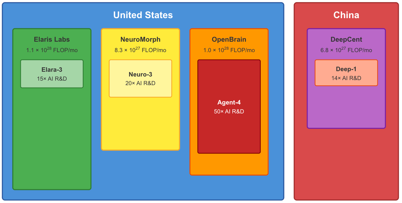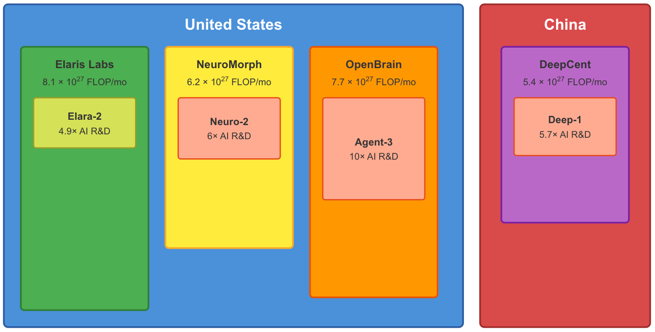 Three dominant AGI companies compete for access to markets and investment. Elaris Labs releases its flagship AI agent Elara-1, which proves to be an extremely reliable “personal assistant” for everything from making educational videos to filing taxes. NeuroMorph deploys its own model Neuro-1, setting the frontier on nearly every coding benchmark. Finally, OpenBrain unveils Agent-1, the world’s best automated researcher from biology to mathematics. They begin post-training Agent-2 and immediately benefit from its abilities in their own research, putting them about a month ahead of their competitors in AI R&D capabilities.